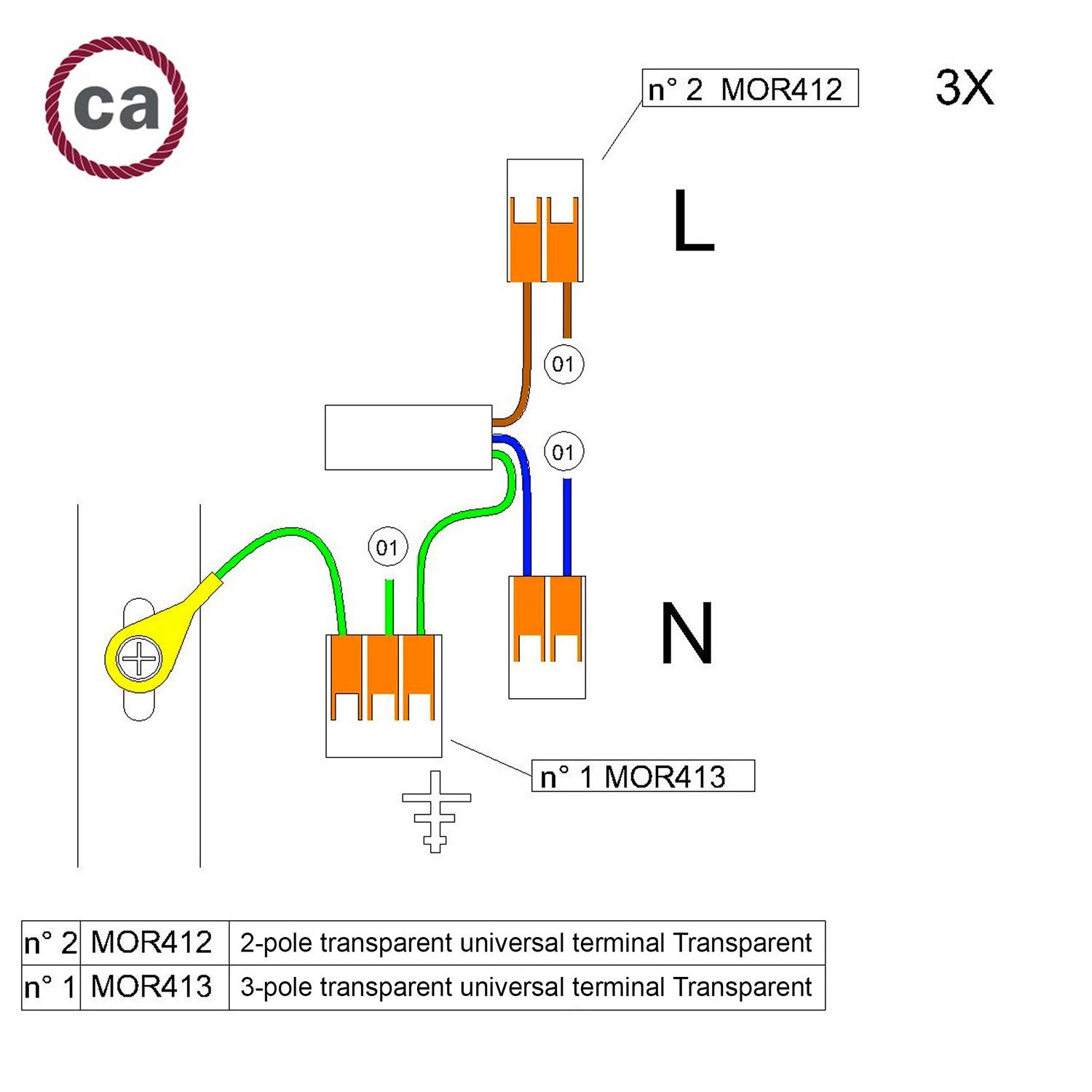 Kit Zubehör Anschluss Lampenbaldachin mit 1 Loch. Das Kit enthält zwei transparente Universalklemmen 2-polig und eine transparente Universalklemme 3-polig.