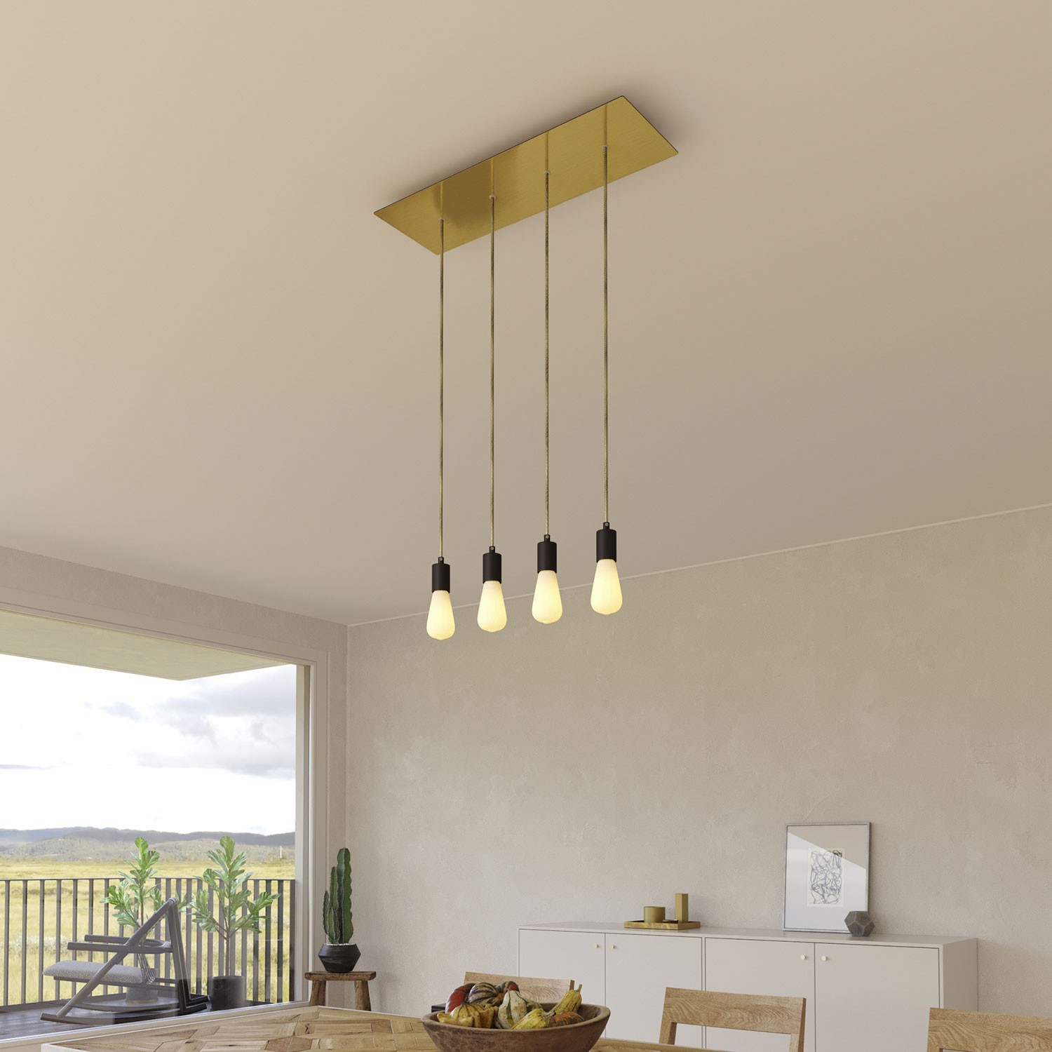 La versione rettangolare a 4 fori è perfetta per realizzare sospensioni multiple sopra un tavolo o un bancone di un bar, sia lasciando le lampadine a vista che aggiungendo un paralume a ogni caduta.